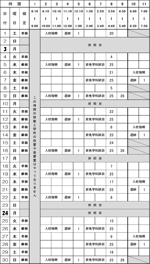 • 入校説明:入校説明会 / 適断:適性診断 / 修検:修了検定 / 卒検:卒業検定 / 数字:学科教習番号